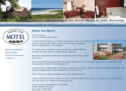 Website created for Arbor Inn Motel. Located North of Boston on historic and scenic route 1A. Centrally located amongst the historic towns of Gloucester, Rockport, Salem, Newburyport, and Rowley. The Arbor Inn is situated among woods and wildlife offering peaceful serenity which is protected by wetlands. Beautiful crane beach with miles of pristine sand is just a short drive away. Rooms are tastefully appointed with careful attention given, top grade brand name mattresses from Tempurpedic, Simmons, and Beautyrest.