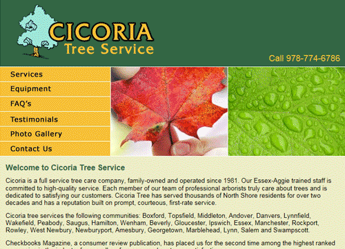 Website created for Cicoria Tree Service. Cicoria is a full service tree care company, family-owned and operated since 1981. Our Essex-Aggie trained staff is committed to high-quality service. Each member of our team of professional arborists truly care about trees and is dedicated to satisfying our customers. Cicoria Tree has served thousands of North Shore residents for over two decades and has a reputation built on prompt, courteous, first-rate service.