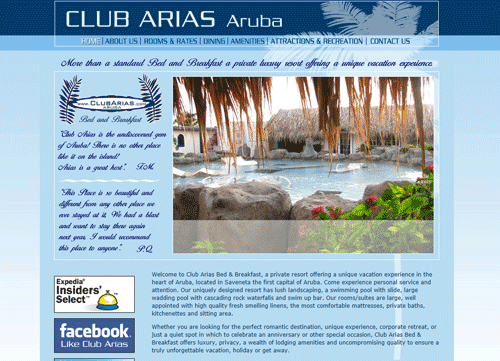 Website was created for Club Arias Bed & Breakfast. They are a private resort offering a unique vacation experience in the heart of Aruba, located in Saveneta the first capital of Aruba. Come experience personal service and attention. Our uniquely designed resort has lush landscaping, a swimming pool with slide, large wadding pool with cascading rock waterfalls and swim up bar. Our rooms/suites are large, well appointed with high quality fresh smelling linens, the most comfortable mattresses, private baths, kitchenettes and sitting area.